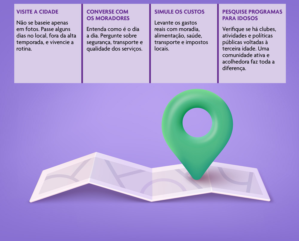 avaliar com calma, visitar as cidades e encontrar o lugar ideal para viver com saúde, tranquilidade e alegria é essencial para uma aposentadoria plena.